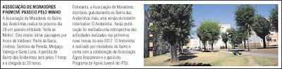 A Associação de Moradores do Bairro das Andorinhas vai realizar no próximo dia 28 de Outubro um passeio intitulado de Volta ao Minho. Este roteiro irá ter passagens por Arcos de Valdevez, Ponte da Barca, Lindoso, Senhora da Peneda, Melgaço, Valença e Santa Luzia. A partida do Bairro das Andorinhas será pelas 7h e a chegada às 20h. O passeio é gratuito para os sócios com as quotas regularizadas, e os não sócios pagam 10€. A inscrição é realizada directamente na sede da Associação de Moradores entre as 20h30 e as 23h.